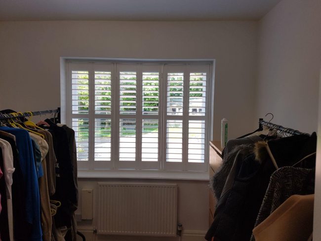 Shutters for added privacy in this walk-in wardrobe / changing room – you can shut the bottom slats for privacy and keep the top ones open for light when you’re getting changed