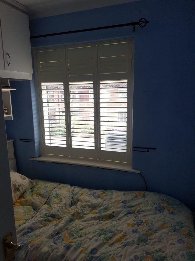 Standard window shutters for this cosy little bedroom – with a mid rail & finished in white to match the window cill ๐