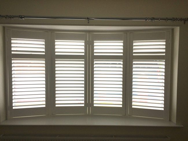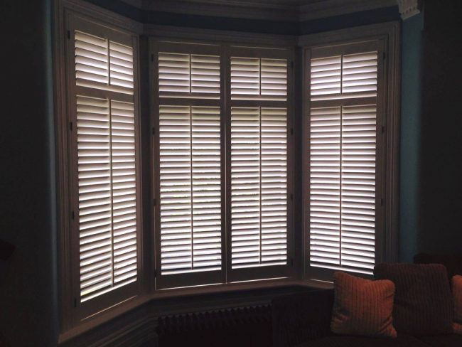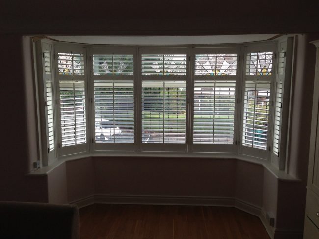 A square bay window shutter installation: These planation shutter were split into three individual shutter panels as the window isn’t continuous – because they are made to measure, shutters can be made to fit in any window!