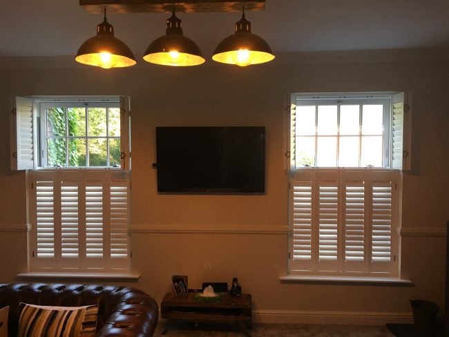 Tier on Tier Shutters throughout for this property in Macclesfield – Another perfect example of how well white shutters and grey walls work together ๐