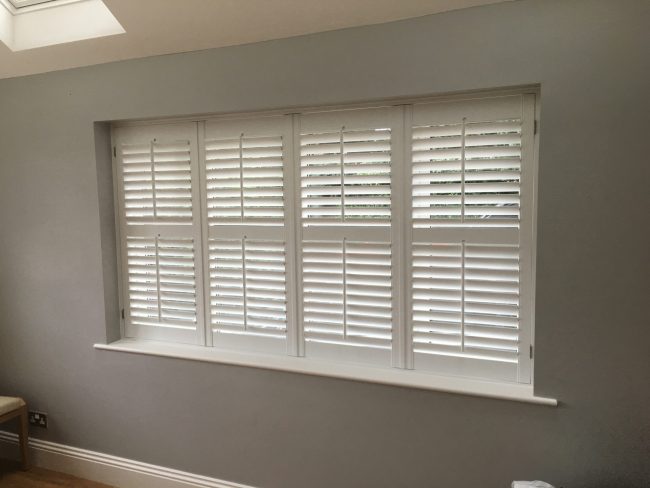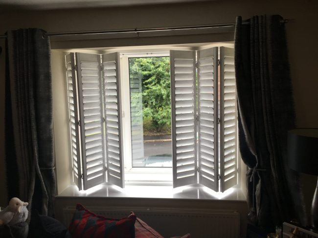 Another happy customer in Failsworth, Manchester: Large bi-folding shutters with a concealed split. Bi-folding shutters can be opened completely with no frame covering the window, giving a perfect view out
