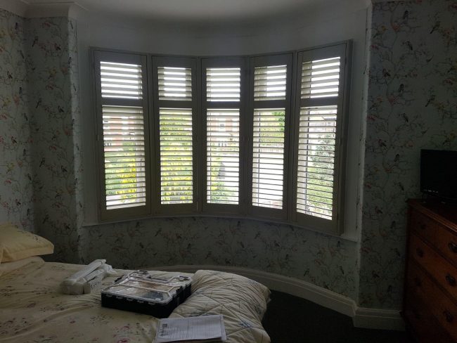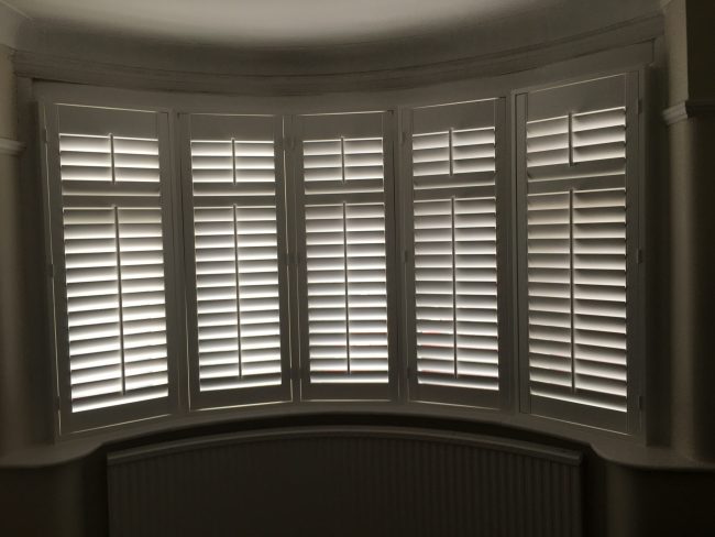 A 5 panel curved bay window installation, even with the top slats close the shutters still let huge amounts of light into the room!