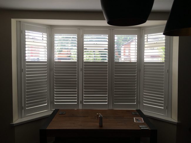 Vivid white 3 sided bay window shutters in Stretford, Manchester – with hidden pushrods and a concealed split.